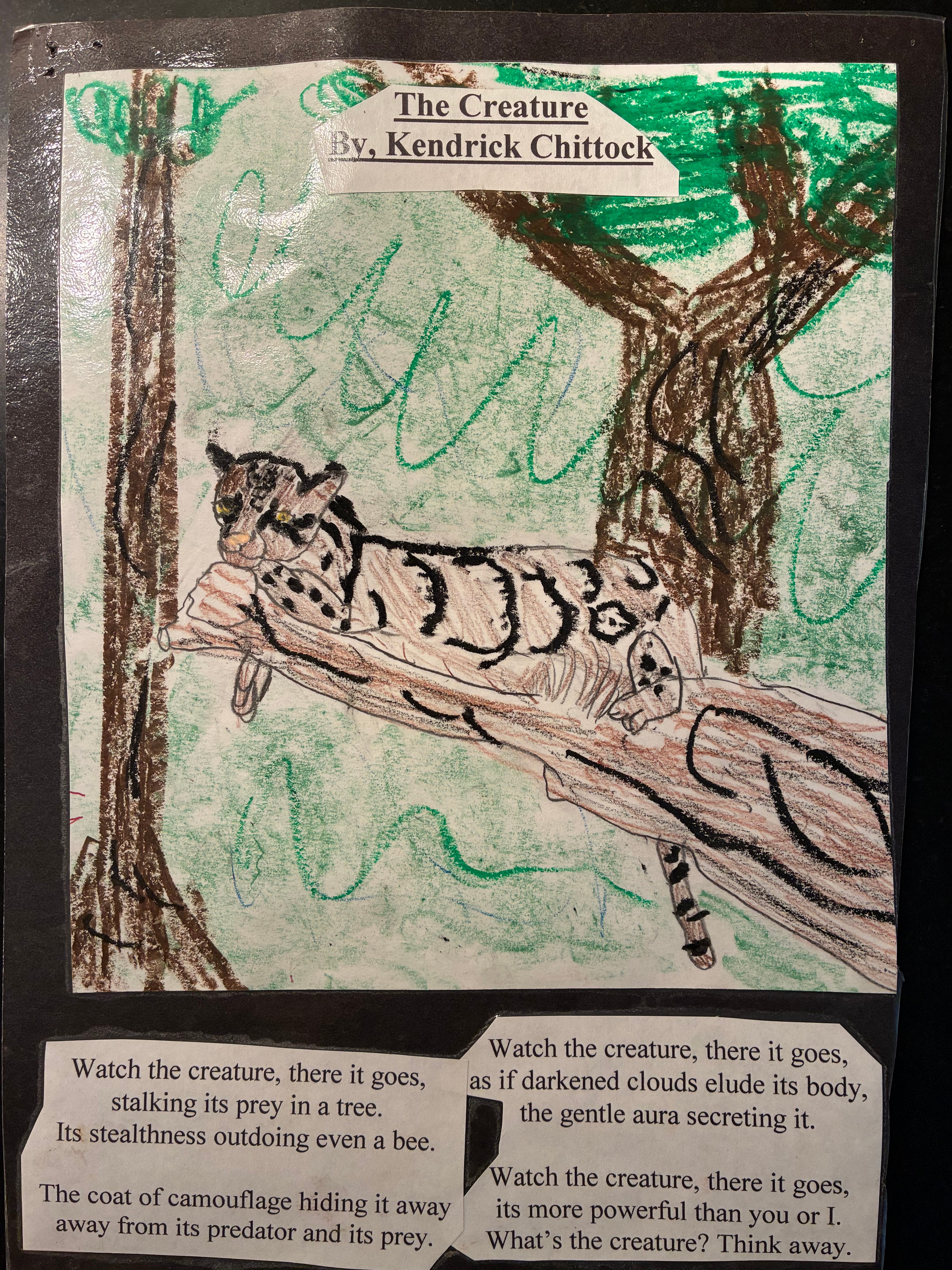 Watch the creature, there it goes, stalking its prey in a tree. Its stealthiness outdoing even a bee.