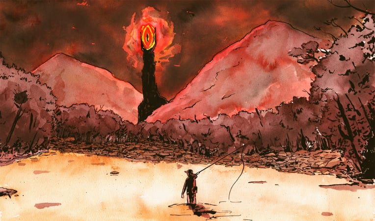 The Angling Eye of Middle Earth is known to poke holes in tourists’ waders and forces his victims to do cold plunges wearing cotton. He chains anglers into water that is too warm to freeze but solidifies enough to be slush; a thick soupy substance that allows no drifts, no swings, and no presentations. In the dungeons of the Tower, fish float by bleeding, bottoms-up, with no life left to chase a fly or leap from beneath the shivering substance that grabs hold of legs, wooly buggers and wading belts. The only hats allowed in the entire kingdom of Mordor say ‘Treble Hook Trouble’. There is no escape; there is only the river of slush, forever infiltrating every waterproof/breathable membrane mankind can fathom. I checked my shirt tag to be sure it did not read Fruit of the Doom.
