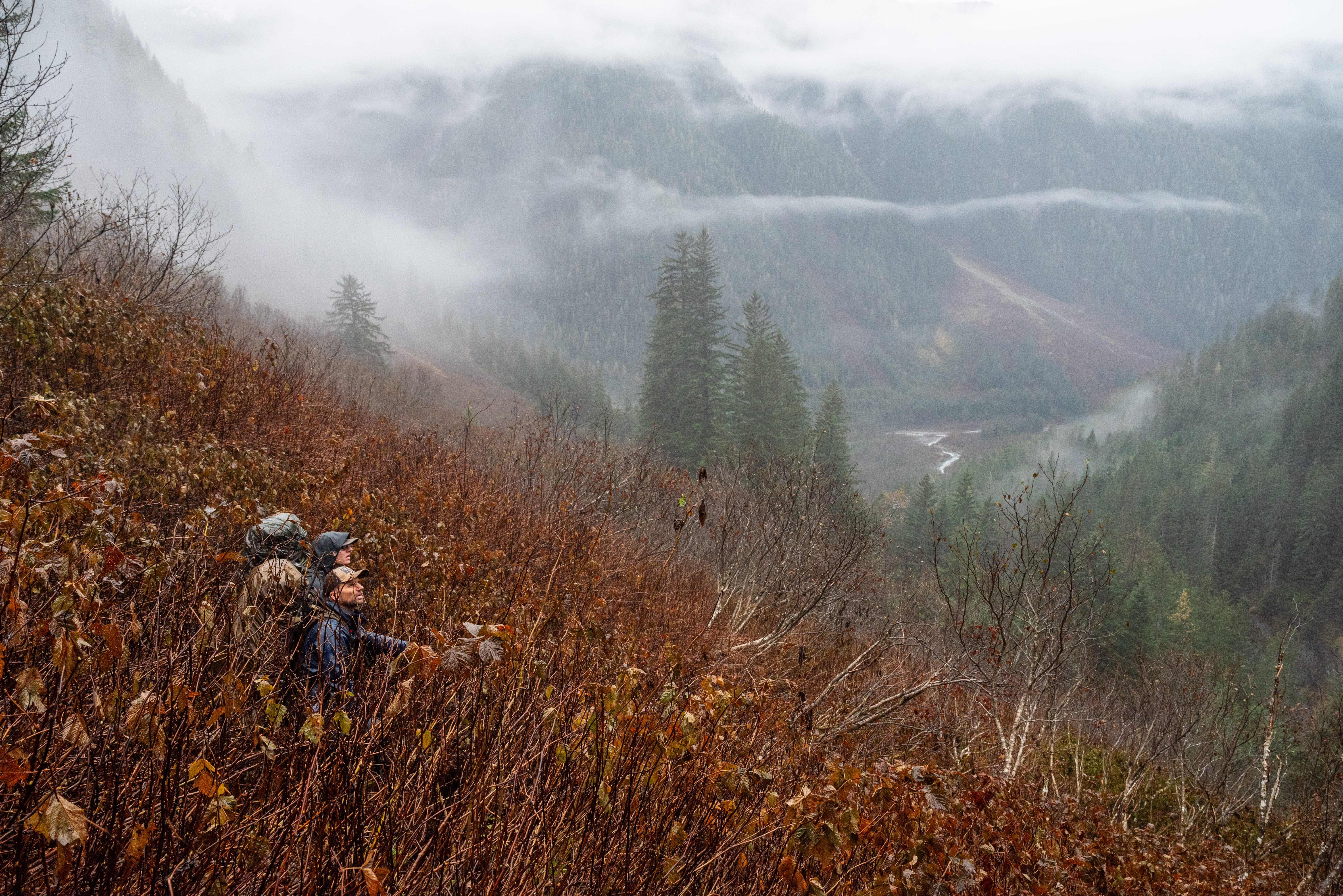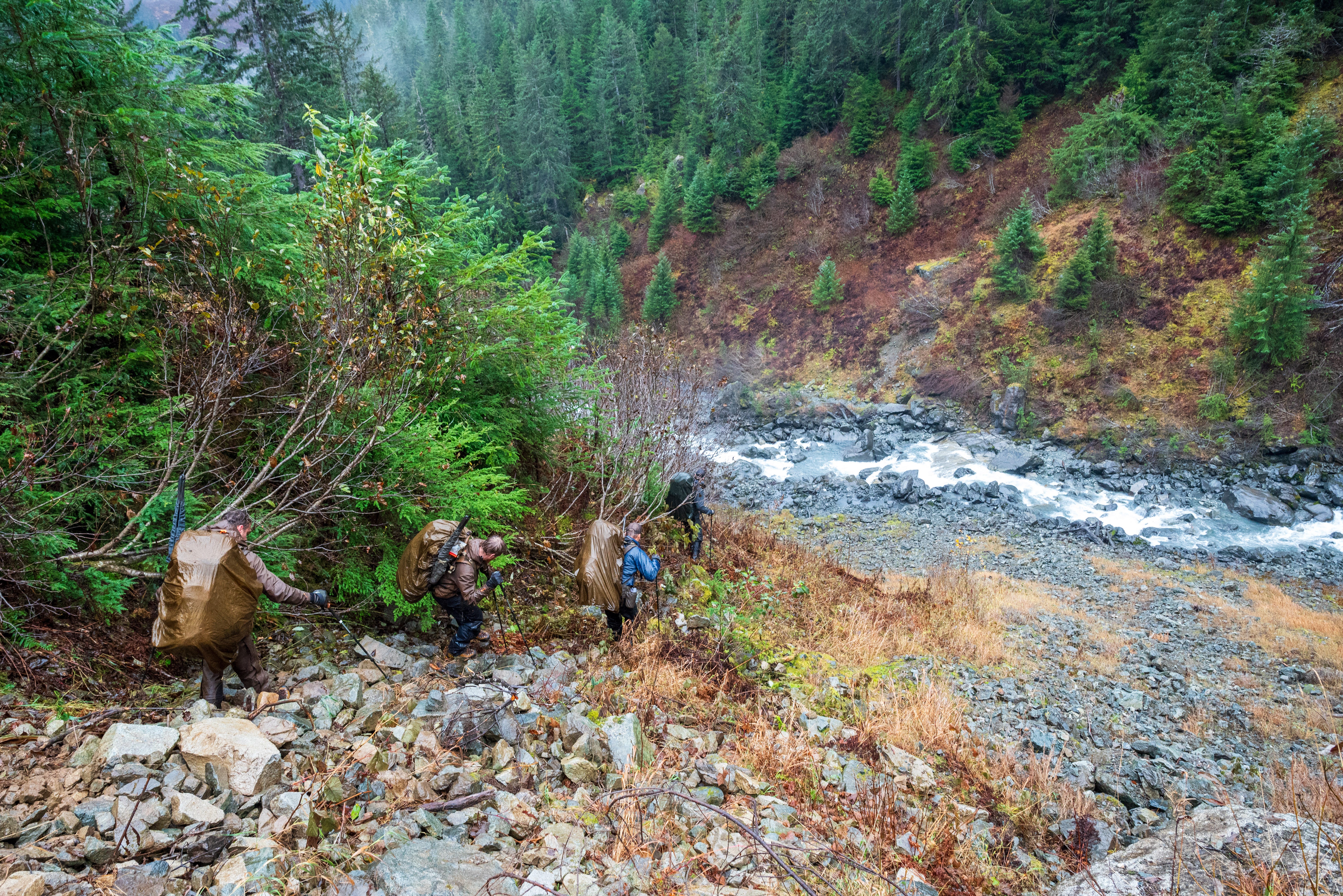 A wet, long, slog. We've gained altitude through miles of thick slide alder. With rain
