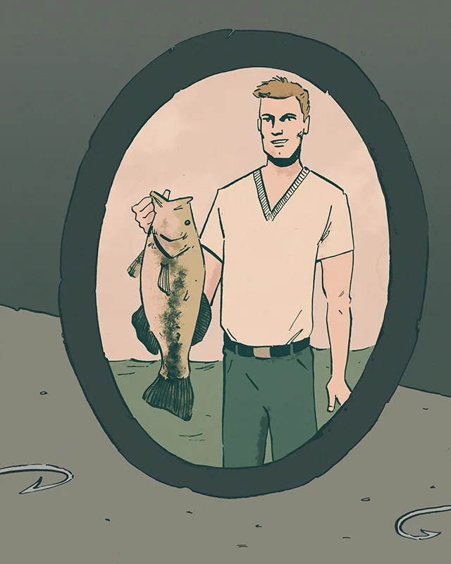 The picture is of the good old days. It sits on a shelf next to other photos, trinkets and memorabilia that few people have ever seen. The man in the small round frame holds a bass with a mouth big enough to swallow a fist. I know the size because his arm is one third of the way into the belly of the beast.